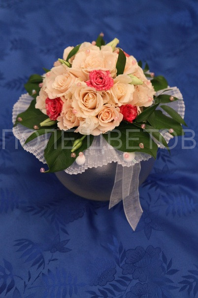 Состав: роза, рускус, салал, флористическое украшение, портбукетница, лизиантус, роза кустовая, юбкаРомантический свадебный букет из семнадцати персиковых роз, необыкновенно красивых пестро-розовых кустовых роз, нежного белого лизиантуса, дополненный яркой зеленью салала и рускуса, украшенный белоснежной воздушной юбкой собран на портбукетнице для прекрасных невест. Этот нежный букет создан для самого лучшего дня в Вашей жизни.