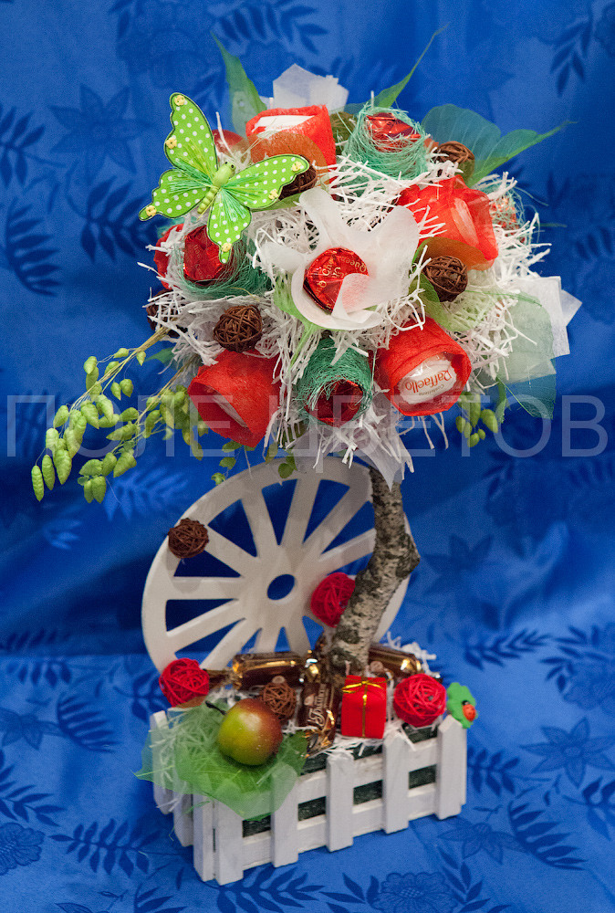Состав: бабочка, флористическое украшение, конфеты, кашпо, сухоцветы, оазисЯркая, контрастная, очень вкусная композиция из конфет и сухоцветов будет смелым незабываемым презентом для Ваших друзей и близких людей. Дерево из ароматных конфет станет прекрасным украшением на чайный стол и сделает праздник радостным