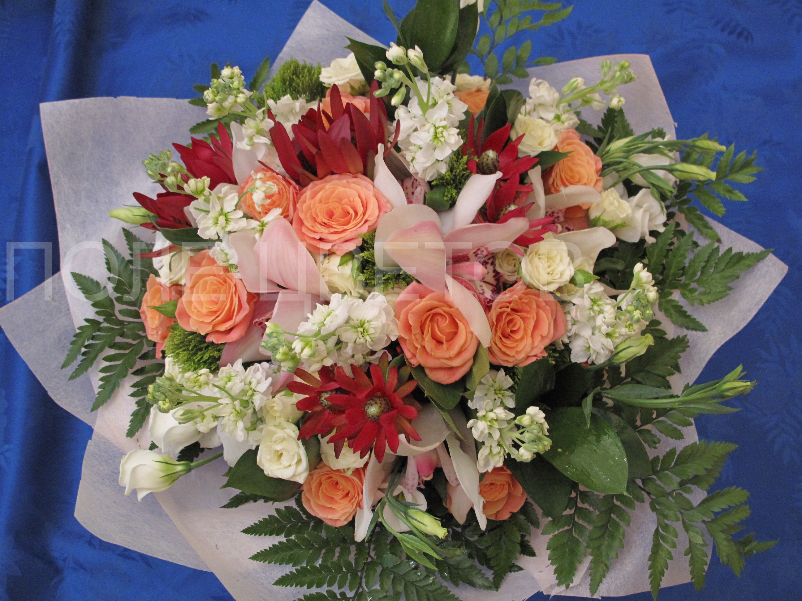 Восковые бело-​розовые орхидеи-​бабочки, крупные персиковые розы, кисти белоснежной матиолы, необычные тропические красные игольчатые цветы сафани сансет, нежные белые головки лизиантуса, зеленые шапки трахелиума, сочная зелень папоротника и рускуса делают впечатление от букета незабываемым. Этот элегантный букет станет прекрасным подарком любимому человеку.