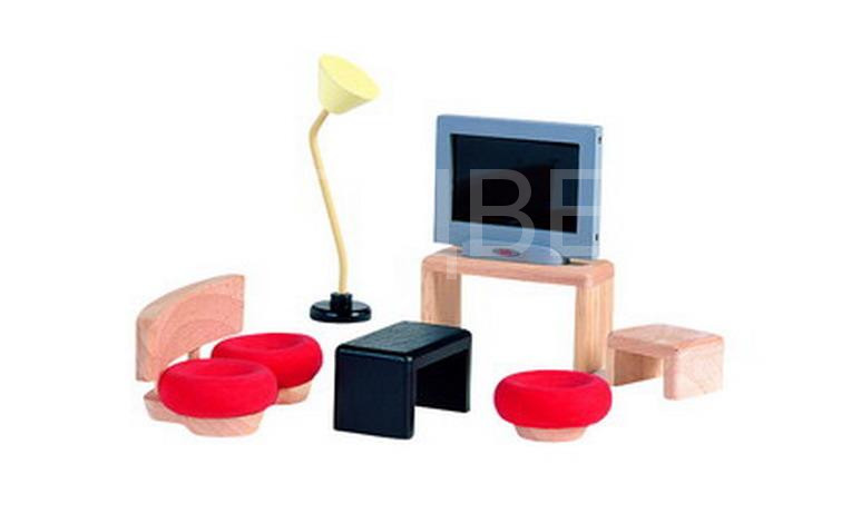 Набор стильной современной мебели Гостиная включает в себя стойку с телевизором, двухместный диван и пуф, журнальный столик, тотршер и подставку, на которой можно расположить, например, цветочный горшок, или посадить кошку. Все игрушки выполнены из каучукового дерева с использованием нетоксичных красок и специально изготовлены с закруглёнными краями, чтобы избежать вероятности травмирования. Размеры мебели: 12.0 x 6.5 x 5.3 см (диван). Размеры упаковки: 18.8 x 9.3 x 23.0 см. Для детей от 3 лет.