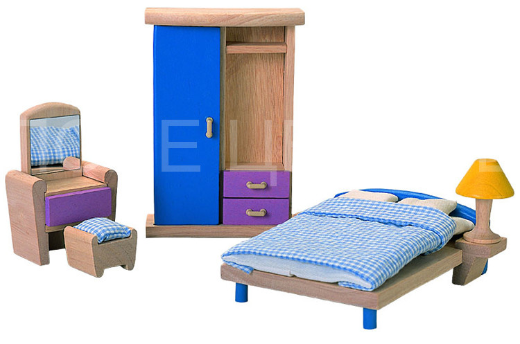 Спальный гарнитур включает в себя кровать, туалетный столик, табурет, лампу, тумбочку, платяной шкаф, подушки и матрац. Играя с набором, дети улучшают свои социальные навыки, речь, а также воображение. Набор получил награду “Хорошая игрушка”, Германия. Все предметы выполнены из каучукового дерева и хлопковой ткани с использованием нетоксичных красок. Размеры мебели: 14.8 x 16.2 x 5 (кровать). Размеры упаковки: 18.8 x 7.5 x 23.0 см. Для детей от 3 лет.