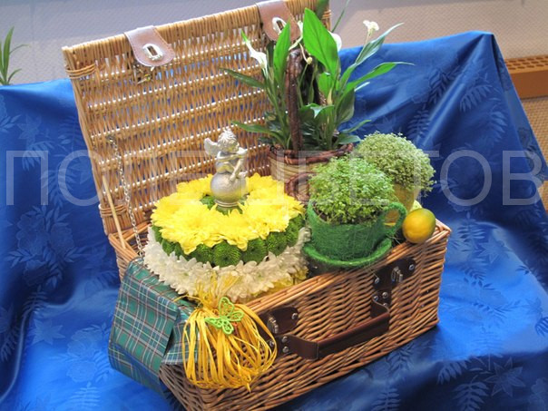 Внутри многократно используемого плетеного чемодана разместился весь сладкий набор из цветов к чаю. Спатифиллум с белыми цветками и блестящей зеленью листьев в чайнике напоминает нам облако пара, поднимающегося над кипятком. Рядом уже готовы две чашечки с великолепной пенкой — растением солейролия. И, конечно же, волшебный цветочный торт из разноцветных хризантем. Это оригинальный подарок для любителей туризма.