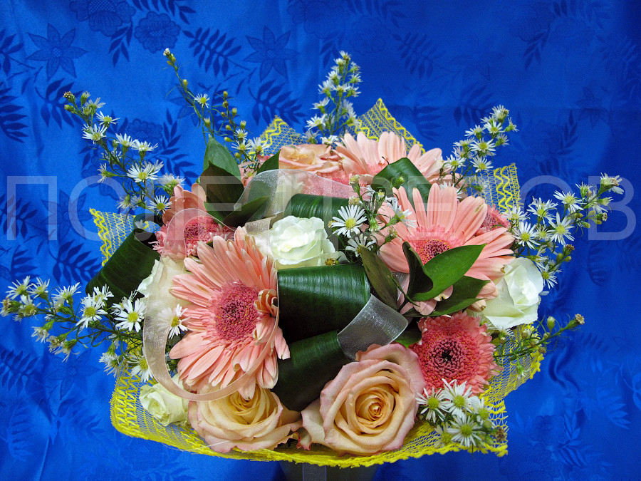 Состав: аспидистра, астер, герберы, роза, рускус италия, упаковка сетка