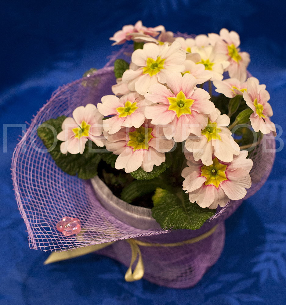 Нежно-розовая примула упакована в красиво оформленный сеткой и флористическими украшениями горшок. Это симпатичное растение станет радостью для любого дома: ее можно поставить на подоконник , а можно высадить в тенистое место в саду.