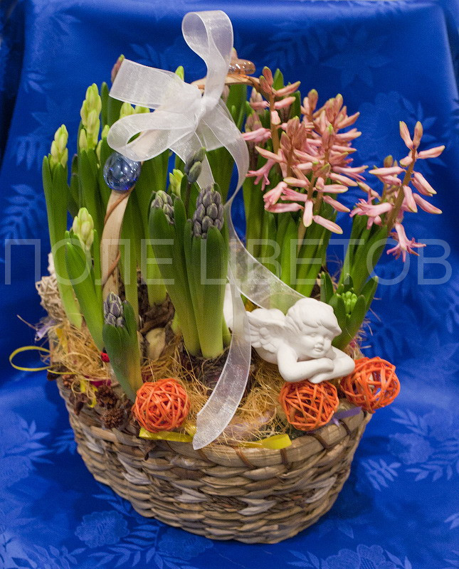 Состав: флористическое украшение, гиацинт, корзина, сувенир ангел