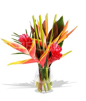 Этот букет от салона Поле цветов станет оригинальным поздравлением любимого человека. Цветы ярко-​красной джинжер и необыкновенной красно-​желтой геликонии карибии, расположившиеся рядом с сочными стеблями тифы, оригинальными листьями стрелиции, робелины и аспидистры, делают букет удивительно гармоничным при строгости его формы.