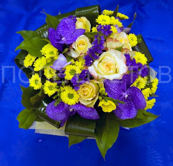 Букет, состоящий из таинственных фиолетовых орхидей Ванда и кистей сиреневой статицы, нежных желто-​розовых роз и ярких лимонных хризантем — ромашек, ароматной фрезии и свежей зелени салала и аспидистры, не только подарит прекрасное настроение, но и поможет исполнить Ваше самое заветное желание.