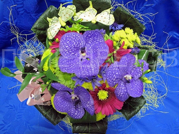 Состав: аспидистра, бабочка, васильки, гербера мини, орхидея ванда, рускус, статица, трителия, фатсия, фрезия, хризантема кустовая, упаковка каркасСимфония синего цвета… Этот редкий, очаровательный цвет вдохновил наших флористов создать великолепный букет в оттенках желтого, синего и объединяющегося малинового цвета. Великолепная синяя орхидея Ванда, малиновые минигерберы, изящные васильки и кустики трителии (колокольчики), пушистые ярко-желтые пуговки хризантем, несколько веточек лимонной фрезии и ярко-синей статицы, украшенные листьями рускуса, аспидистры и фатсии добавляют оригинальности и загадочности этому очень симпатичному букету.