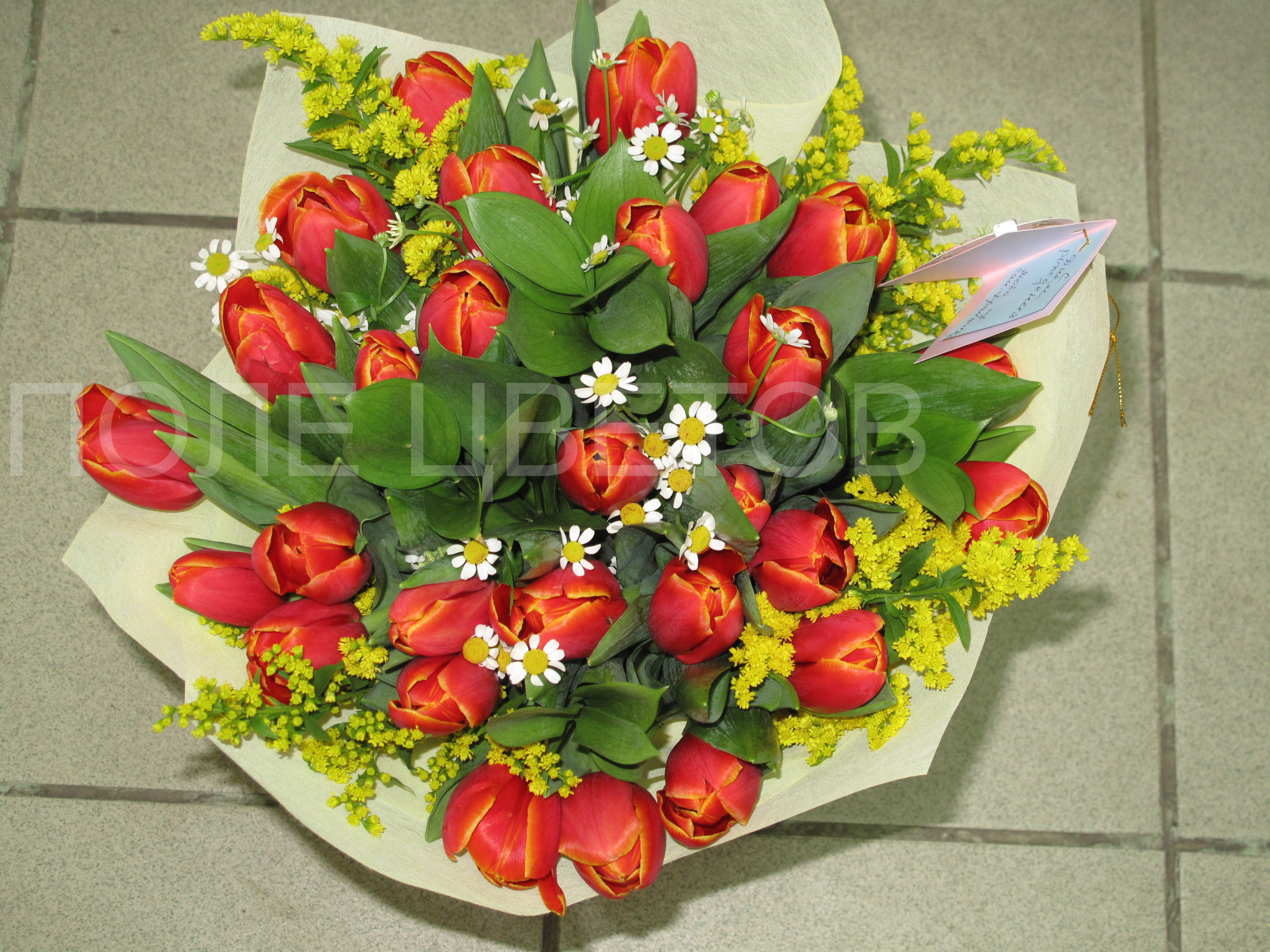 Этот великолепный букет, состоящий из двадцати семи ярких красных тюльпанов, нежных мелких ромашек камилы, кистей желтого солидаго и свежей зелени рускуса, станет прекрасным подарком для любимого человека по любому поводу. Он подарит весеннее настроение и яркий солнечный свет.